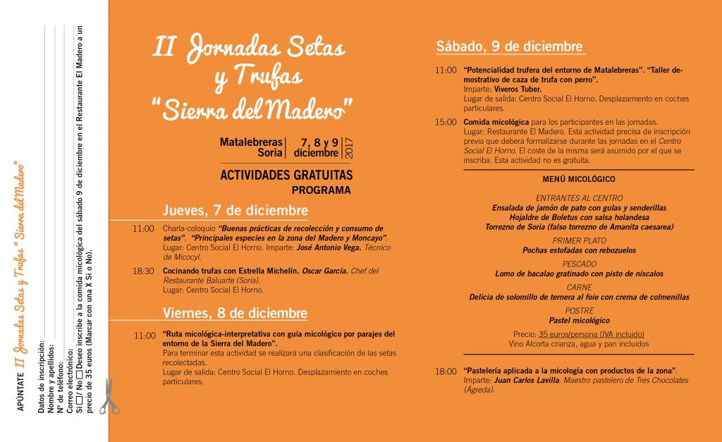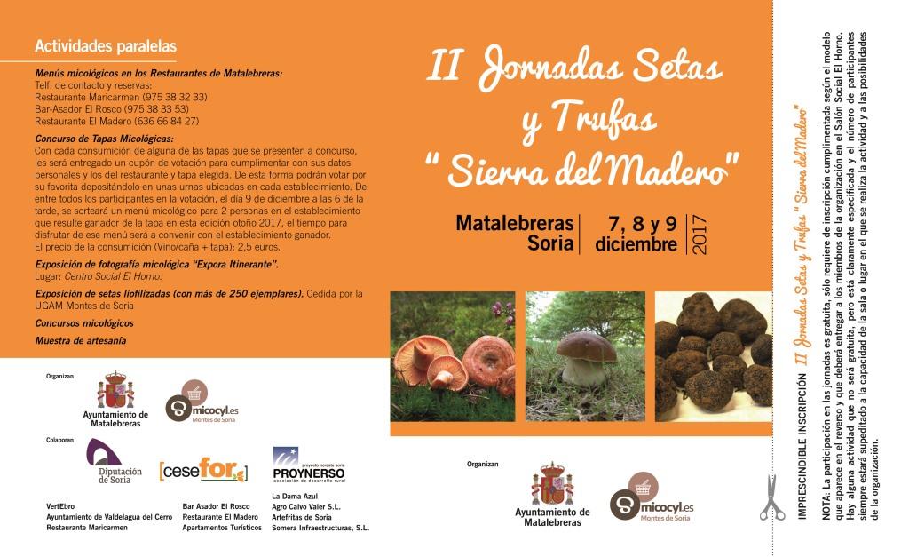 La localidad soriana de Matalebreras organiza, en colaboración con la UGAM Montes de Soria a través del programa Micocyl, sus II Jornadas Setas y Trufas Sierra del Madero los días 7, 8 y 9 de diciembre de 2017. Han desarrollado un interesante programa en el que se combinan charlas, exposiciones, salidas al campo, cocina micológica con un Chef con Estrella Michelín, repostería micológica, concursos, tapas y menús micológicos, artesanía... al final una amplísima oferta que gira en torno a este preciado recurso que son las setas y trufas de la zona del Madero.