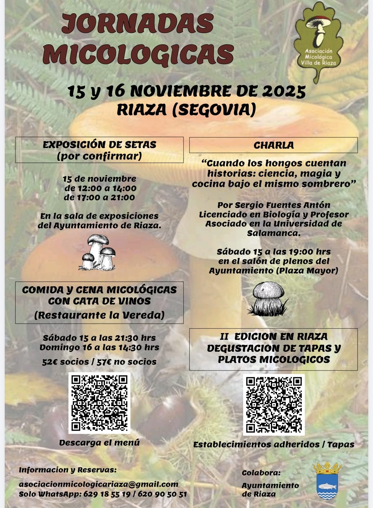Organizadas por la Asociación Micológica Villa de Riaza, con la colaboración del Ayuntamiento de Riaza y los bares y restaurantes locales, estas jornadas combinan la divulgación científica con una exquisita oferta gastronómica en torno a las setas silvestres de la comarca.