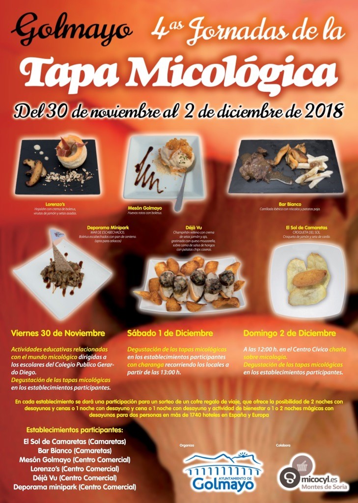 El ayuntamiento de Golmayo en colaboración con la Asociación Montes de Soria organizan las cuartas Jornadas de la Tapa Micológica en dicha localidad. Para ello ha programado: