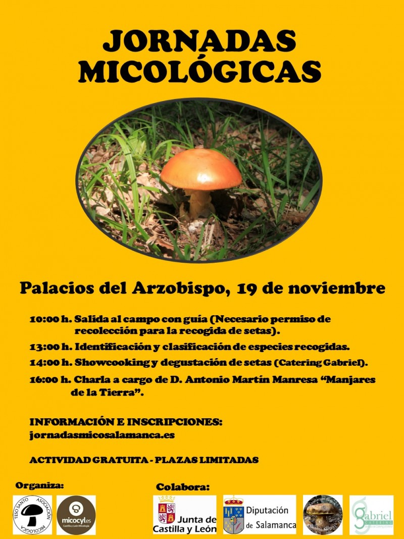 El sábado, 19 de noviembre, el programa Micocyl, junto con la Asociación Teso Santo, organiza unas Jornadas Micológicas en el municipio salmantino de Palacios del Arzobispo, perteneciente al Acotado Micológico "Ribera de Cañedo".