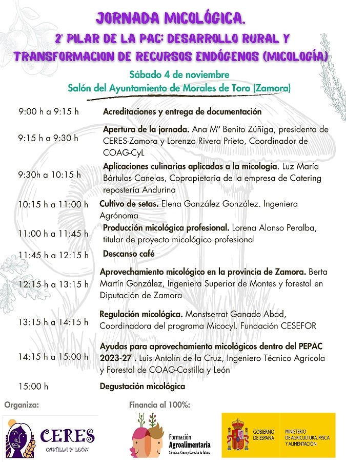 La jornada se desarrollará en el salón del Ayuntamiento de Morales de Toro y se extenderá desde las 9 de la mañana hasta las 3 de la tarde. El programa diseñado para este día es muy completo e incluye diversos aspectos relacionados con la profesionalización de la actividad micológica. Los temas a tratar abarcan el cultivo y las aplicaciones culinarias de las setas, la producción micológica profesional, la regulación micológica y las ayudas disponibles para el aprovechamiento micológico con los nuevos fondos de la PAC para el periodo 2023-27.