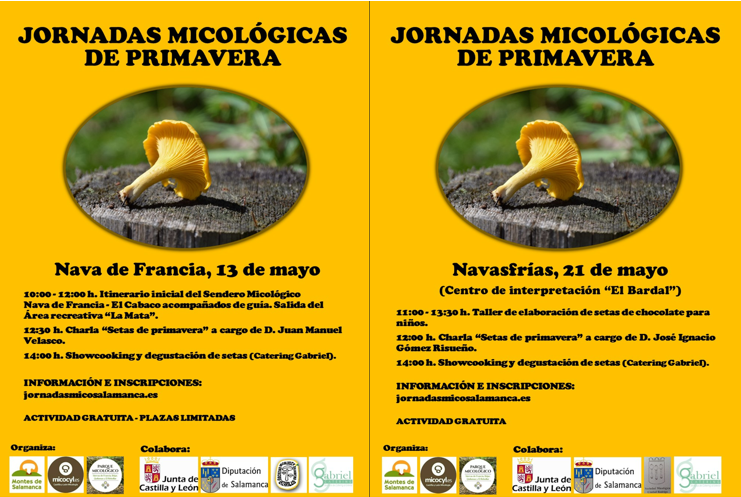Las jornadas comenzarán el sábado 13 de Mayo en Nava de Francia, donde se realizará un pequeño recorrido por el Sendero Micológico Nava de Francia-El Cabaco, una charla dedicada a “Setas de Primavera” impartida por D. Juan Manuel Velasco de la Sociedad Micológica Salmantina Lazarillo y finalizará con un Showcooking y degustación de setas a cargo de Catering Gabriel. La siguiente jornada tendrá lugar el domingo 21 de Mayo en Navasfrías, donde se realizará un Taller de setas de chocolate para niños, una charla dedicada a “Setas de Primavera” impartida por D. José Ignacio Gómez Risueño y finalizará con un Showcooking y degustación de setas a cargo de Catering Gabriel.