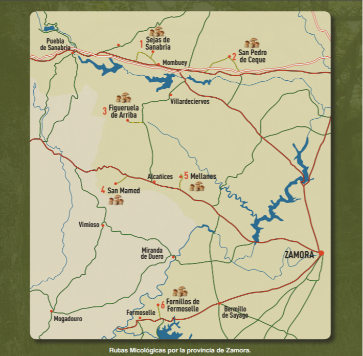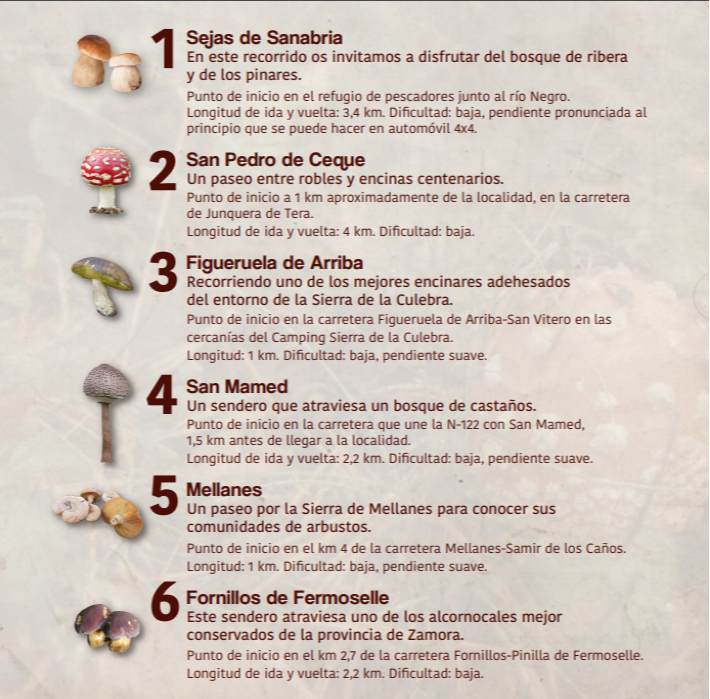 La Diputación de Zamora y la Comunidad lntermunicipal de Terras de Trás-os-Montes, desde el proyecto FRONTUR, una iniciativa de cooperación transfronteriza entre España y Portugal con el objetivo de desarrollar y potenciar el territorio de la Frontera, han acondicionado varias rutas micológicas por la provincia de Zamora. Se trata de seis itinerarios autoguiados con balizas y carteles que proporcionan información sobre los distintos tipos de vegetación y las setas más características de cada paraje.