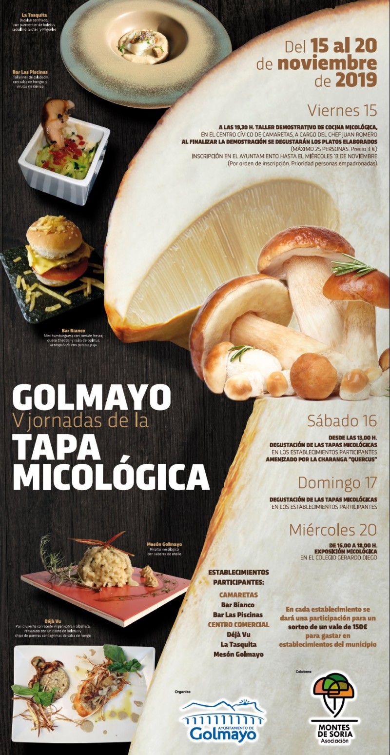 El Ayuntamiento de Golmayo, en colaboración con la Asociación Montes de Soria organizan diferentes actividades dentro de las V Jornadas de la Tapa Micológica que tendrá lugar desde el 15 al 20 de noviembre de 2019.