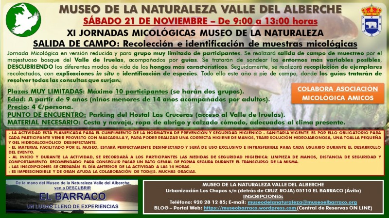 Jornada micológica en versión reducida y para grupo muy limitado de participantes. Se realizará salida de campo de muestreo por el majestuoso bosque del Valle de Iruelas, acompañados por guías. Se tratarán de sondear los habitats más variables posibles, descubriendo los diferentes modos de vida de los hongos más característicos. Seguidamente se realizará una recopilación de ejemplares recolectados, con explicación in situ e identificación de especies. Todo ello a pie de campo, donde las guías tratarán de resolver todas las dudas que surjan.