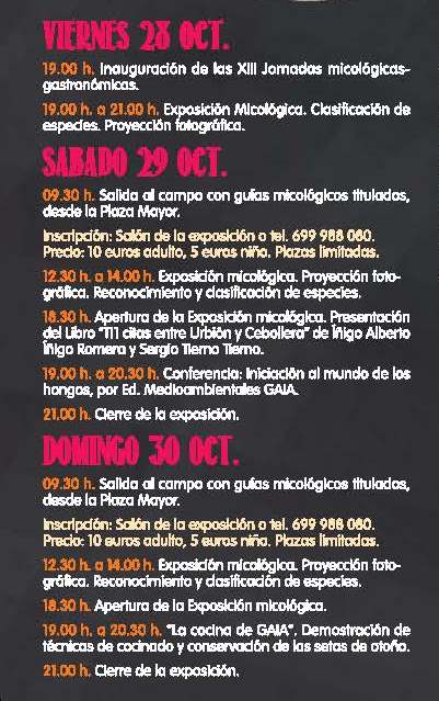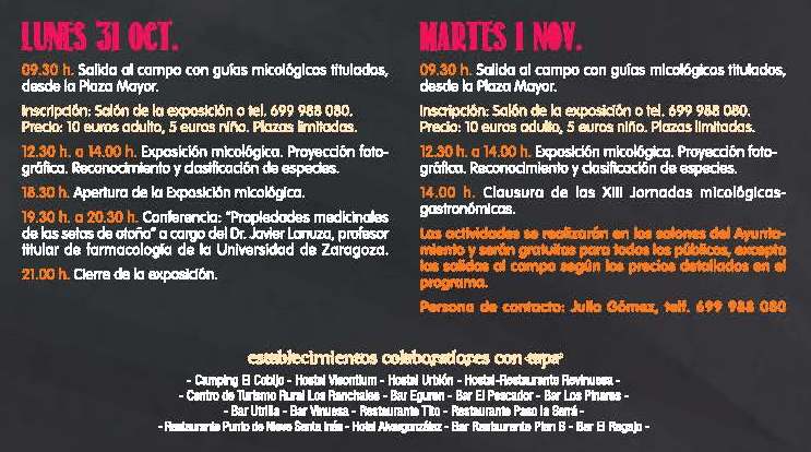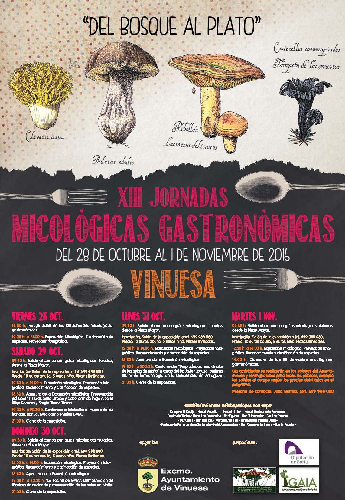 La localidad pinariega de Vinuesa organiza otro año más sus Jornadas Micológicas en las que combina el conocimiento de este recurso a través de las charlas, salidas al campo y exposiciones, así como desde el punto de vista gastronómico con las tapas que elaborarán algunos de los establecimientos hosteleros de la localidad y que podrán ser degustadas durante los días 30, 31 de octubre y 1 , 4, 5 y 6 de noviembre.