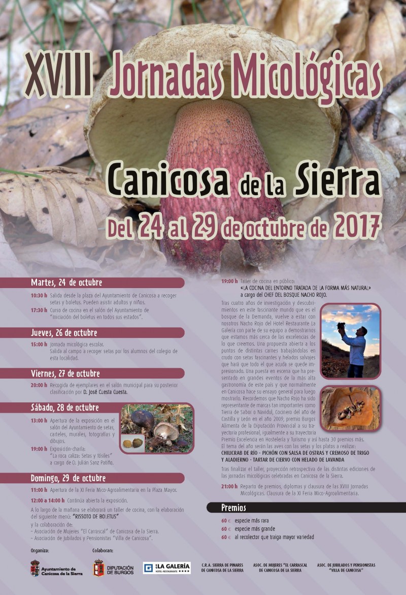 Un año mas y ya van 18, el Ayuntamiento de Canicosa organiza sus populares Jornadas Micológicas. Tendrán lugar desde el martes 24 hasta el domingo 29 de octubre y se desarrollarán de acuerdo al siguiente programa: