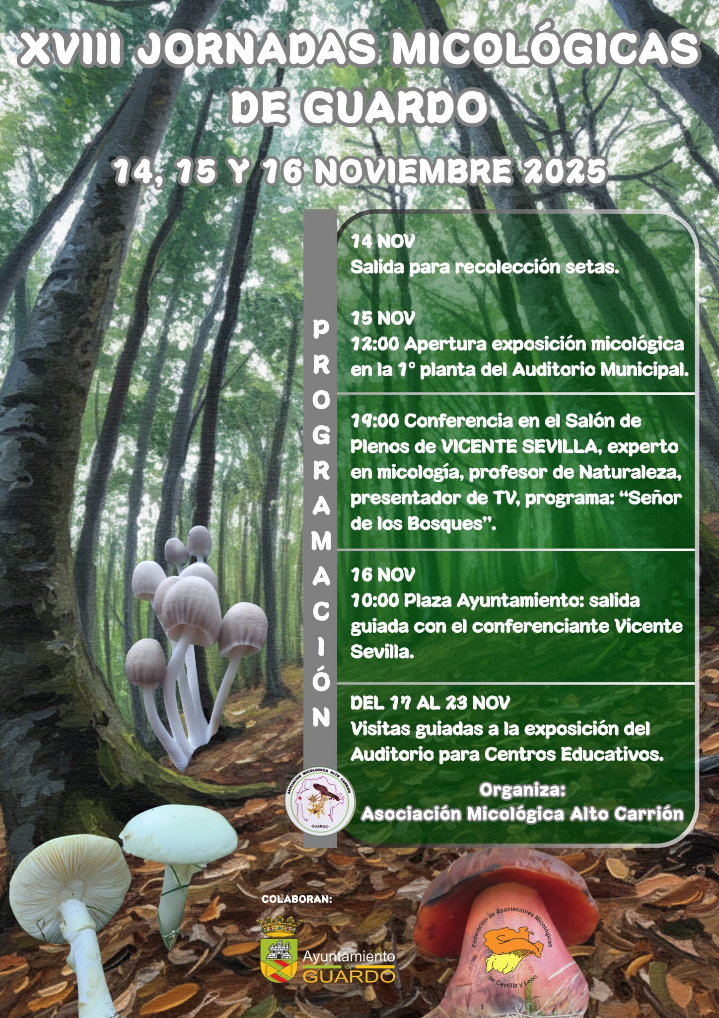 - 19:00 h: conferencia en el Salón de Plenos del Ayuntamiento impartida por el experto en micología Vicente Sevilla, profesor de Naturaleza y presentador del programa televisivo “Señor de los Bosques”.