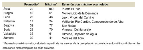 En la siguiente tabla se reflejan valores de precipitación acumulada en las diferentes estaciones meteorológicas de Castilla y León, desde el pasado 17 de septiembre, hasta el 22-09-2020 a partir de los datos proporcionados por la Agencia Estatal de Meteorología para precipitaciones acumuladas en estos últimos días.