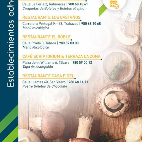 En Tábara, destacan el Restaurante El Roble, que sorprenderá a sus comensales con un Menú Micológico; el Café Scriptorium; Terraza La Zona, que ofrecerán deliciosas tapas de champiñón. Estos establecimientos se suman al Bar Restaurante Bera de Sejas de Aliste con su menú completo de setas, el Restaurante Matellán Hermanos de Rabanales de Aliste, que preparará Croquetas de Boletus y Boletus al ajillo, el Restaurante Los Castaños de Trabazos con otro Menú Micológico, y el Restaurante Casa Fidel de San Vitero, que deleitará con un original Postre Boletus de Chocolate.